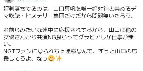 NGT48ファン「評判落ちてるのは山口真帆を絶対神と崇めるヒステリー集団だけ。お前らみたいな連中に応援されてるから山口は仕事が無い」【人望民】