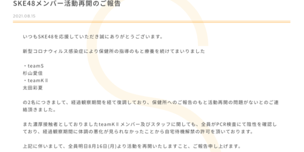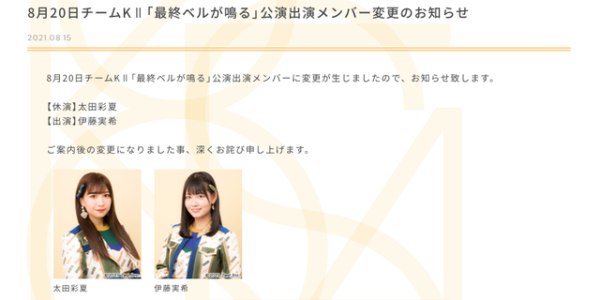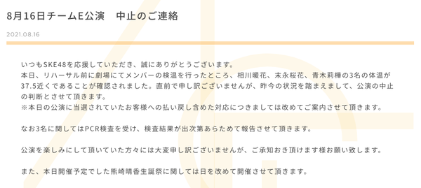 SKE48チームE SHOWROOM「SKE48 Summer Zepp Tour 2021」特番生配信出演メンバーが変更