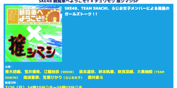 CBCラジオネットで夏まつり2020『SKE48 観覧車へようこそ!! × チュウモリ 推シマシSP』7月26日に配信!