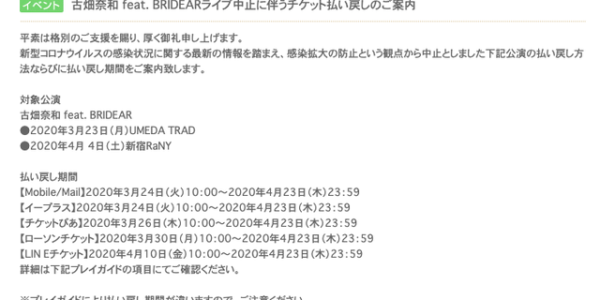 古畑奈和 feat. BRIDEARライブ、カミングフレーバー初単独ライブチケット払い戻しについて