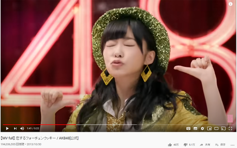 【AKB48】シングルMV再生回数、恋するフォーチュンクッキー(1億9000万回数)、ヘビーローテーション(1億6000万回数)