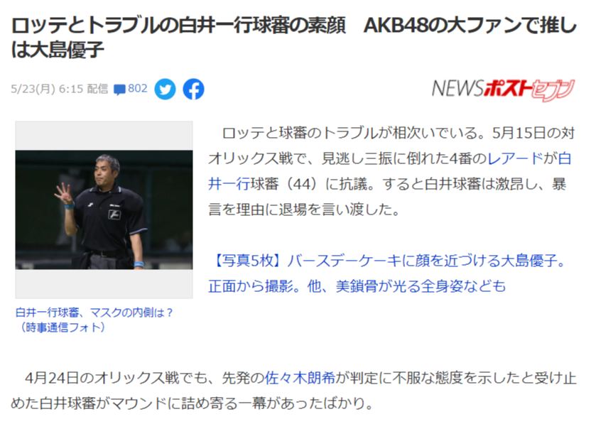 ロッテとトラブルの白井一行球審の素顔 AKB48の大ファンで推しは大島優子