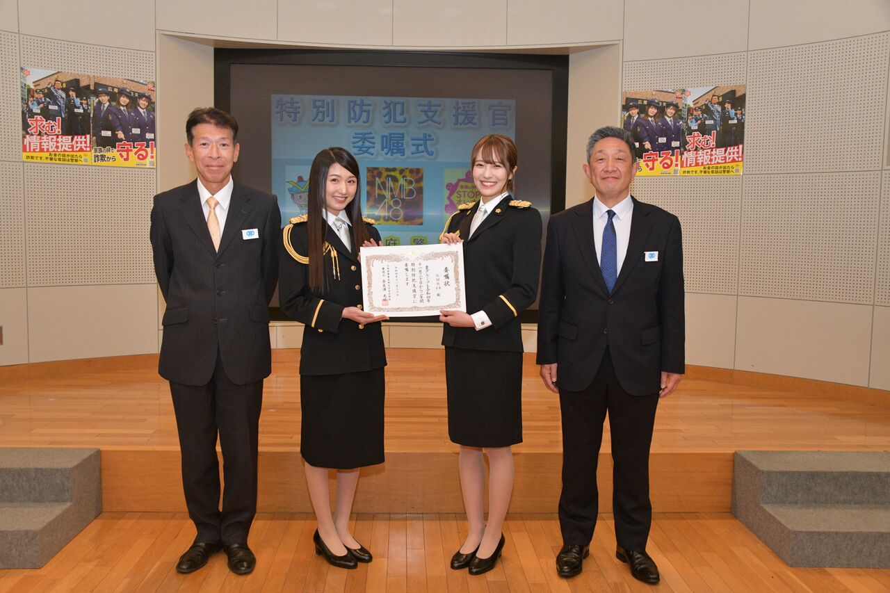 この度、特殊詐欺被害防止に向けた広報啓発活動を推進するため、アイドルグループ『 #NMB48 』に対し、 #SOS47 のメンバーとして引き続き「特別防犯支援官」を委嘱しました。
