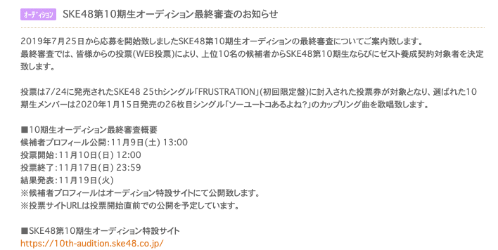 最終審査では、皆様からの投票(WEB投票)により、上位10名の候補者からSKE48第10期生ならびにゼスト養成契約対象者を決定致します。投票は7/24に発売されたSKE48 25thシングル「FRUSTRATION」(初回限定盤)に封入された投票券が対象となり、選ばれた10期生メンバーは2020年1月15日発売の26枚目シングル「ソーユートコあるよね?」のカップリング曲を歌唱致します。
