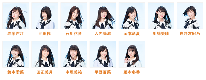 赤堀君江・池田楓・石川花音・入内嶋涼・岡本彩夏・川嶋美晴・白井友紀乃・鈴木愛菜・田辺美月・中坂美祐・平野百菜・藤本冬香
