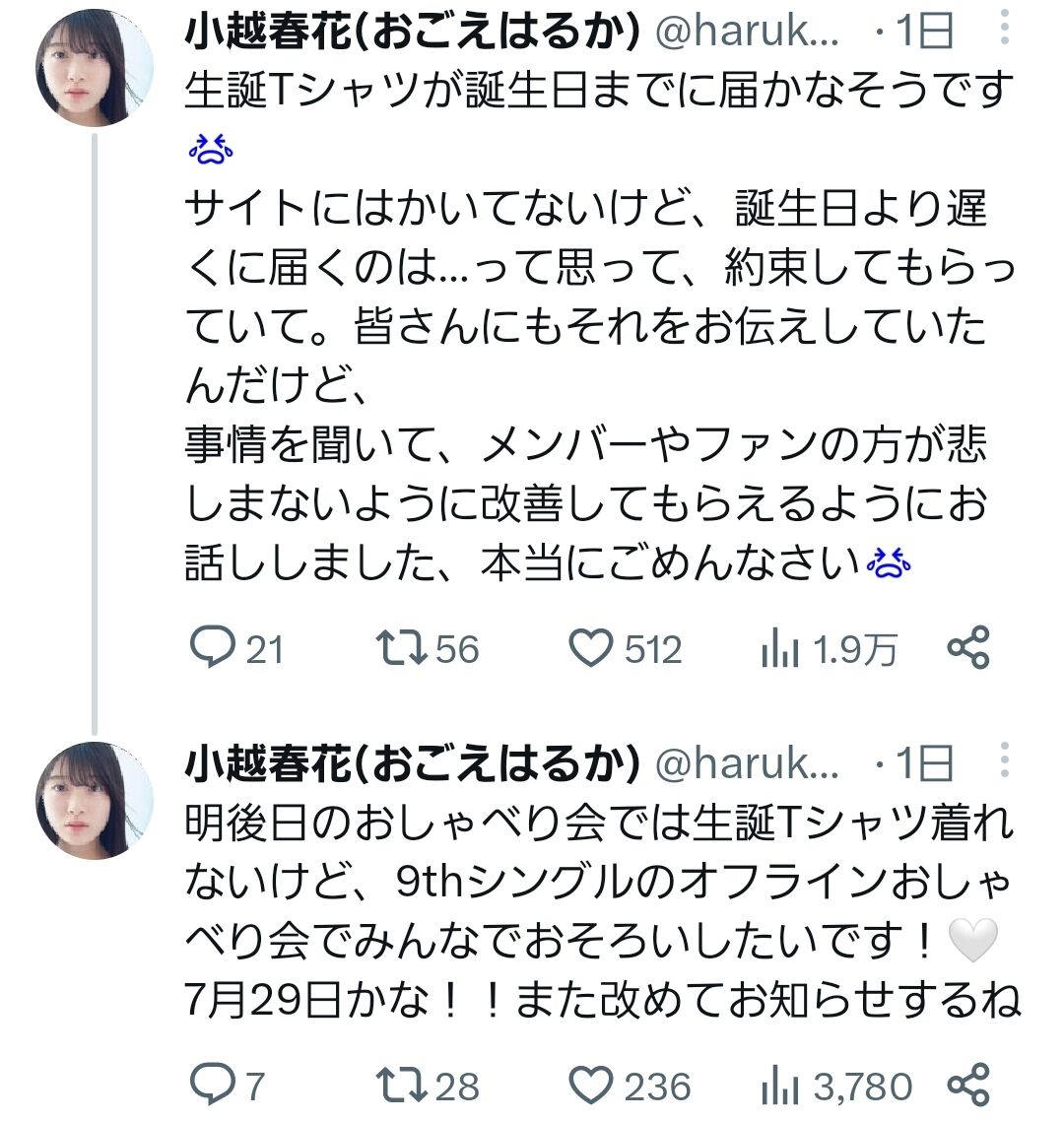 【悲報】俺たちのはるかちゃん、約束を守れない運営について言及しヲタに謝罪