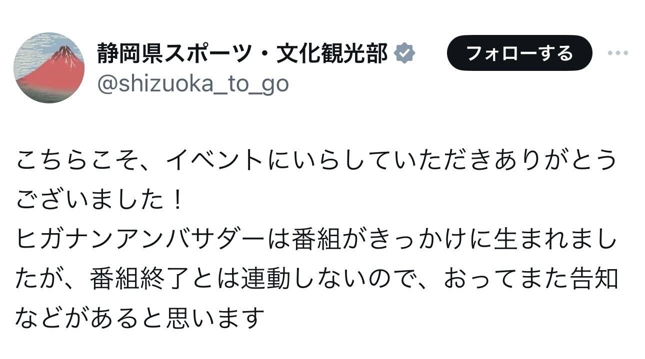 【朗報】静岡県の「ヒガナンアンバサダー」は「最近聞いた!」終了後も継続される模様