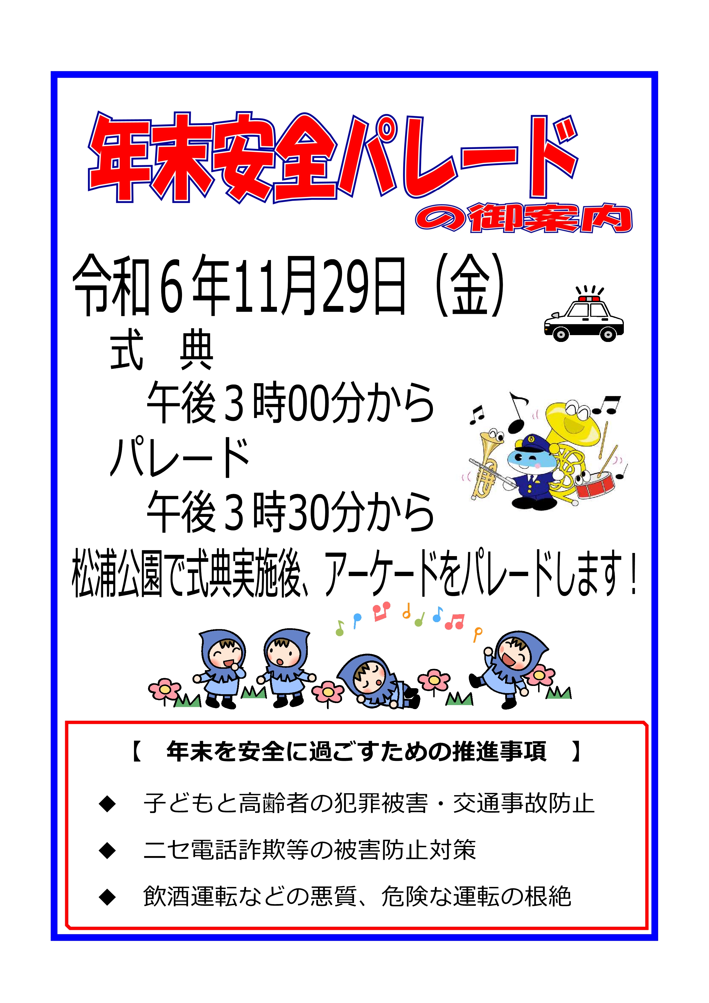本年11月29日金曜日、「年末安全パレード」を行います。当日は、SKE48で活躍するさせぼ観光大使の池田楓さんに1日警察署長を委託し、関係団体の皆さんと年末の犯罪被害・交通事故防止等を呼びかけますので、皆さんぜひ足を運んでください。#SKE48 #パレード pic.twitter.com/IYQ5Hq5ugf— 【公式】長崎県警察 (@NPP_kikaku) November 25, 2024
