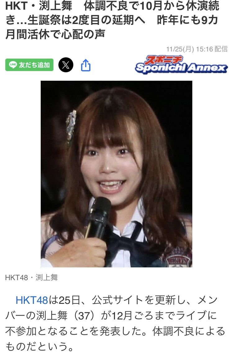 HKT48は25日、公式サイトを更新し、メンバーの渕上舞(37)が12月ごろまでライブに不参加となることを発表した。体調不良によるものだという。
