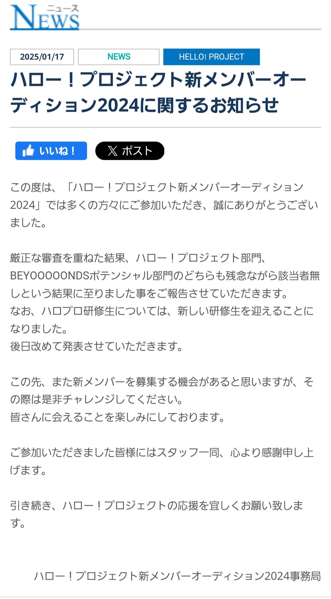 【悲報】ハロプロさん、新メンバーオーディションでまさかの「該当者なし」