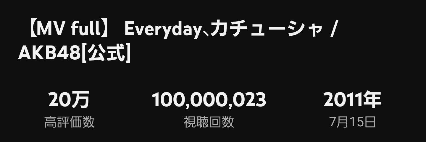 【速報】「Everyday、カチューシャ」MV1億再生達成!AKBとしては4作目!20周年の節目に大台に乗る
