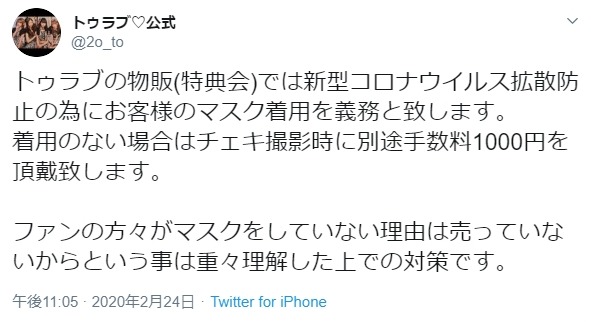 4人組アイドルグループ2oLovetoSweetBullet(通称トゥラブ)が24日、公式ツイッターでマスク非着ファンへの物販の販売価格を1000円プラスすることを発表した。