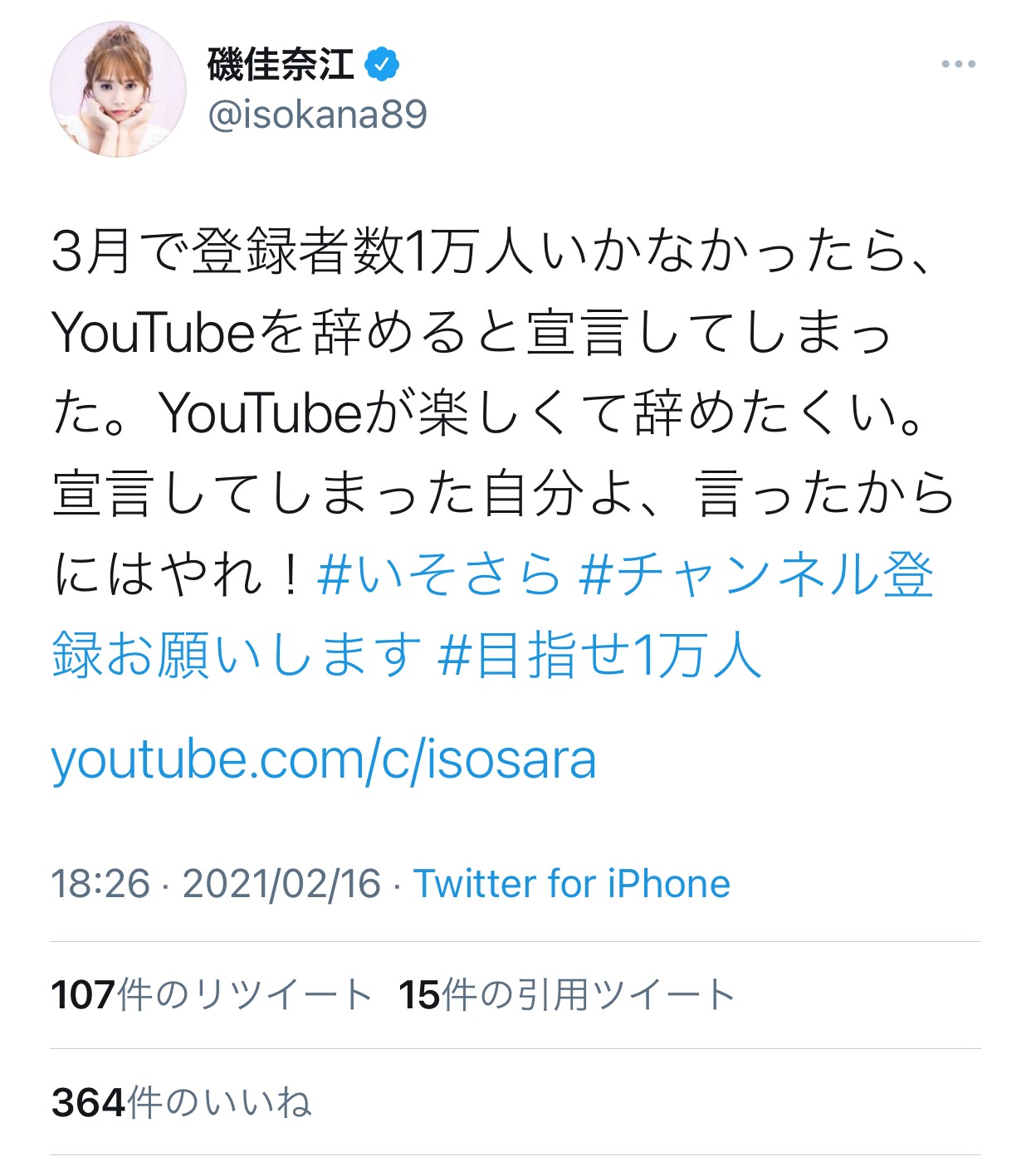 【元NMB48】磯佳奈江「3月中に登録者数1万人いかなかったらYouTube辞めます」