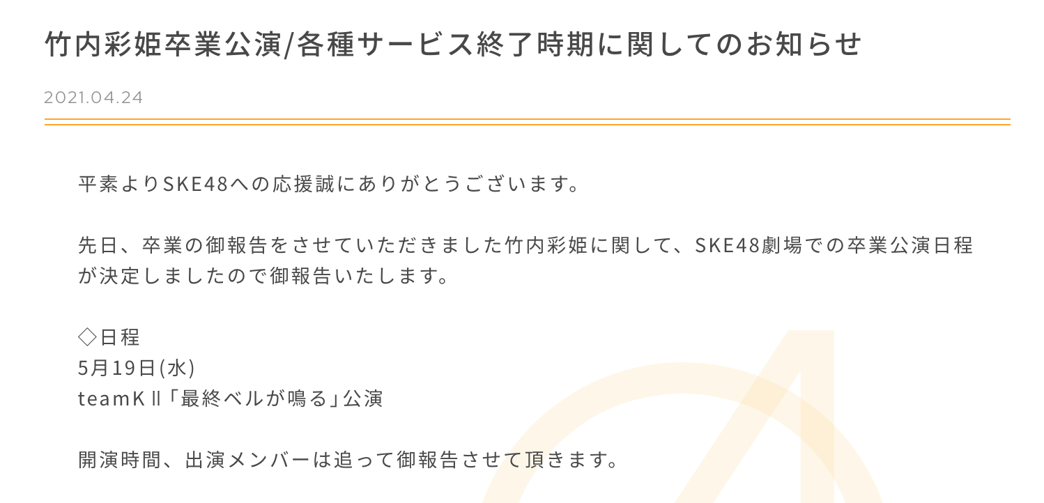 先日、卒業の御報告をさせていただきました竹内彩姫に関して、SKE48劇場での卒業公演日程が決定しましたので御報告いたします。