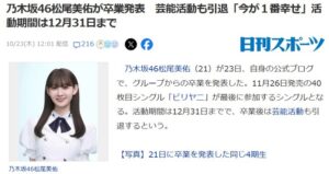 【速報】乃木坂46松尾美佑が卒業発表、芸能活動も引退!活動期間は12月31日まで