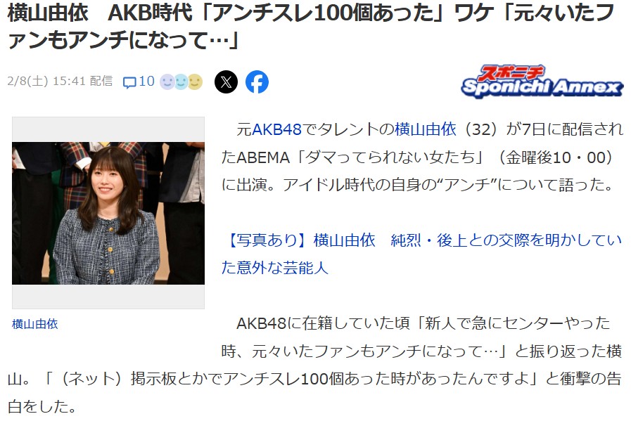 横山由依「AKB48時代、5chにアンチスレが100個あった」←これマジなの?