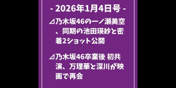 日刊乃木坂ニュース1/4号⊿乃木坂46の一ノ瀬美空、同期の池田瑛紗と密着2ショット公開⊿乃木坂46卒業後 初共演、万理華と深川が映画で再会⊿乃木坂卒業生の伊藤万理華と深川麻衣が共演を振り返る⊿乃…