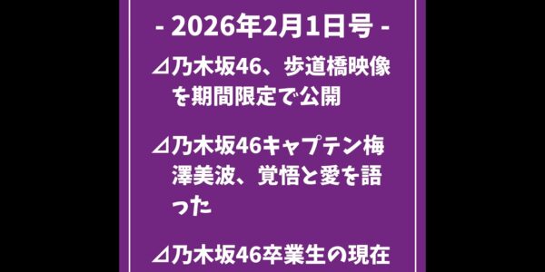日刊乃木坂ニュース2/1号⊿乃木坂46、歩道橋映像を期間限定で公開⊿乃木坂46キャプテン梅澤美波、覚悟と愛を語った⊿乃木坂46卒業生の現在地、所属継続と女優活動が進展…