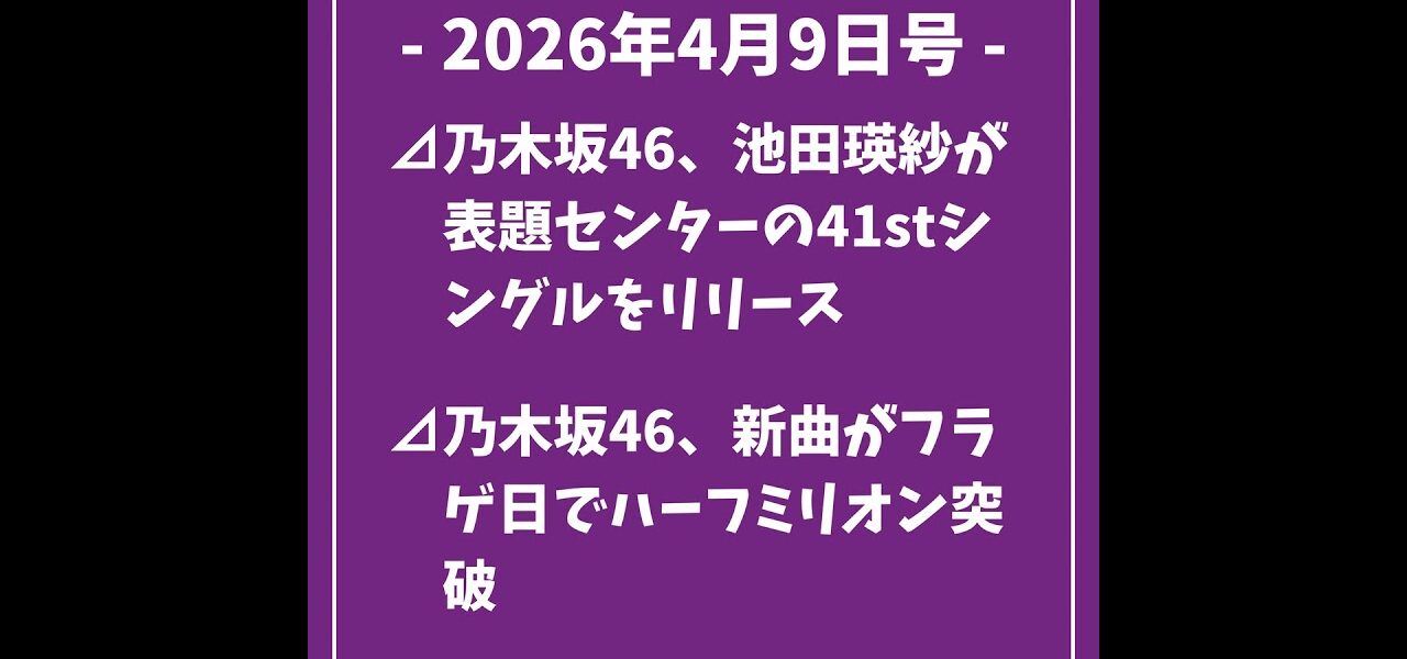 日刊乃木坂ニュース4/9号⊿乃木坂46、池田瑛紗が表題センターの41stシングルをリリース⊿乃木坂46、新曲がフラゲ日でハーフミリオン突破⊿乃木坂46が日大入学式にサプライズ出演、ミニライブ披露…