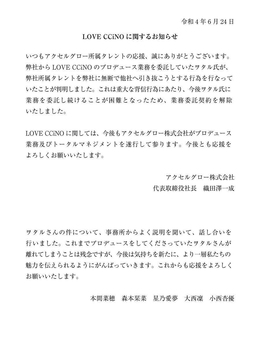 尚、LOVECCiNOに関しては、今後も現事務所がプロデュース業務・トータルマネジメントを行うとしている。