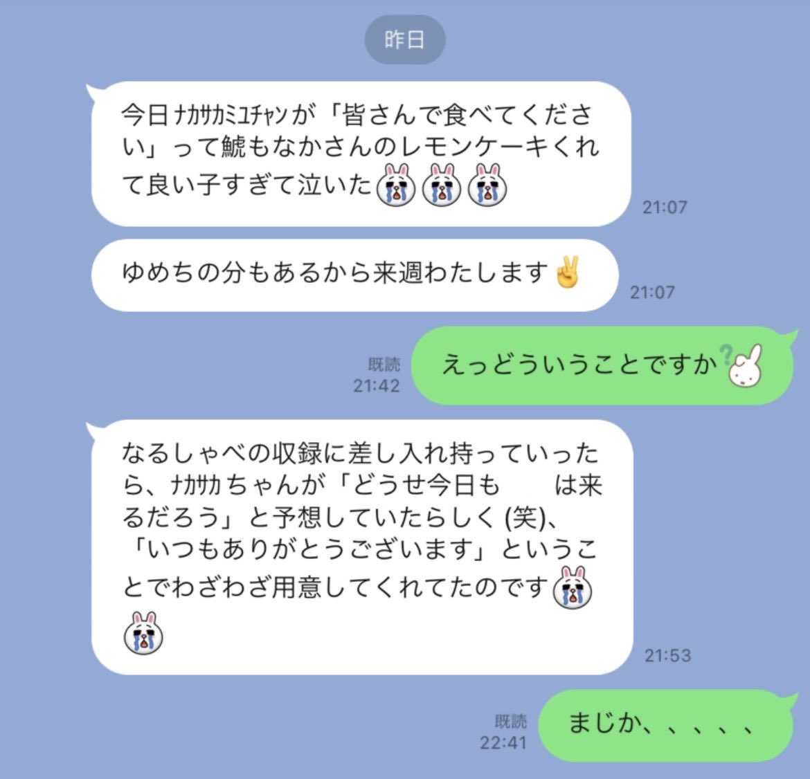 いつも収録のときに差し入れを持って行っているグループ会社の先輩(鎌田推し)からのLINE。