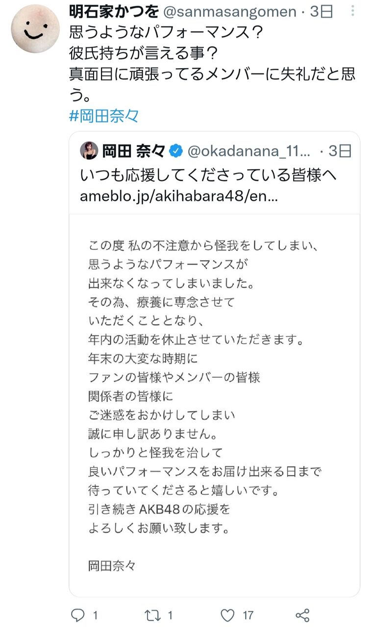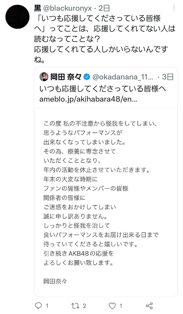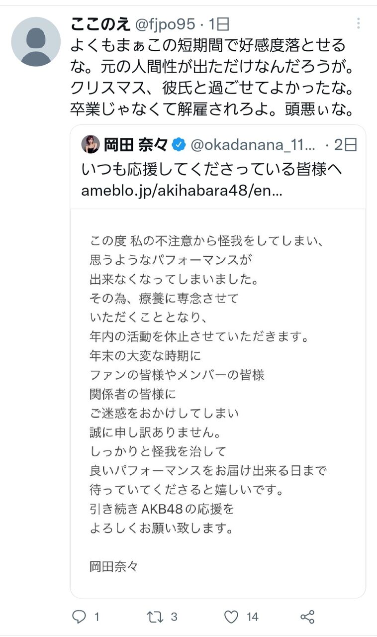 【悲報】岡田奈々さん休業ツイートの引用リツイートが誹謗中傷の嵐になる…