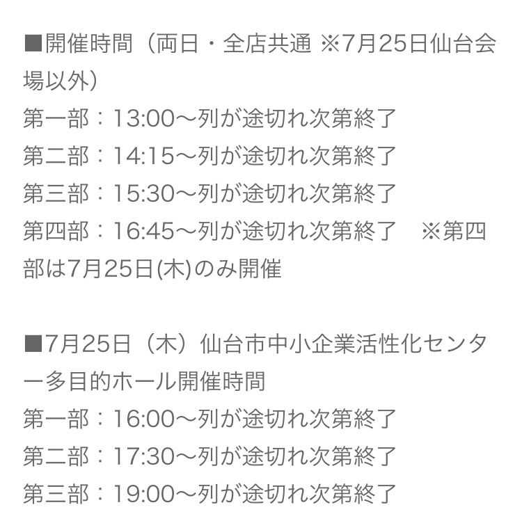 第四部:16:45~列が途切れ次第終了 ※第四部は7月25日(木)のみ開催