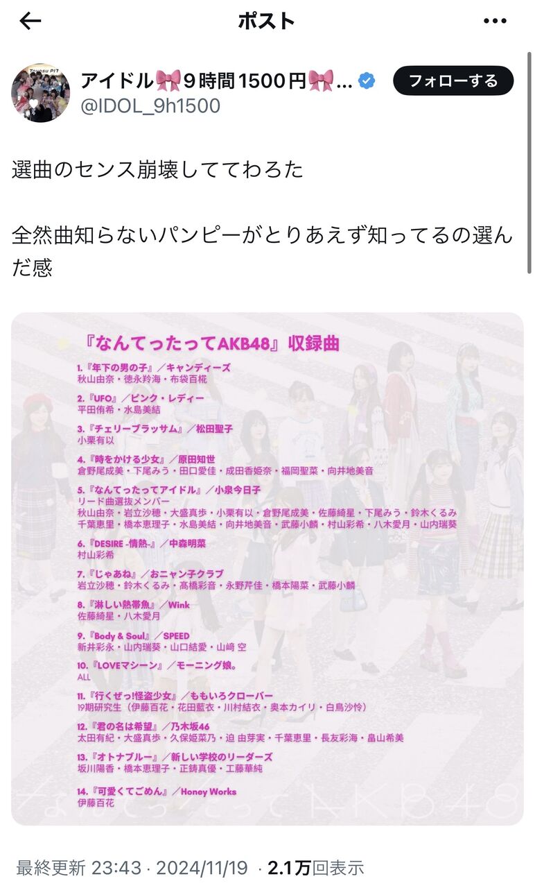 ホームページske48まとめ【悲報】地下アイドル運営さん、公式垢でAKBカバーアルバムの選曲をボロクソに叩く ske48まとめ 【悲報】地下アイドル運営さん、公式垢でAKBカバーアルバムの選曲をボロクソに叩く hktmatomemon 投稿日: 2024年11月21日 1: 名無し48さん 警備員[Lv.14][新芽] (7段) 2024/11/20(水) 19:58:49.09 VIPQ2_EXTDAT: none:none:1000:512:donguri=0/4: EXT was configured 【悲報】写真会が早く終わる若手メンバーさん、残業を強いられる 【悲報】地下アイドル「アイドルに清純を求めないで」→炎上 ずっきーの水着 つばきファクトリーのバスツアーの晩飯がこちら! 【悲報】柏木由紀さん【楽天ブックス限定先着特典】告白心拍数 (初回生産限定盤A CD+DVD)(楽天ブックスオリジナル生写真) [ SKE48 ] 告白心拍数(SG+DVD)(Type-A)(初回生産限定盤) SKE48 avex trax 2024-10-02 続きを読む Source: SKEまとめもん 共有: Facebook で共有するにはクリックしてください (新しいウィンドウで開きます) Facebook クリックして X で共有 (新しいウィンドウで開きます) X いいね:いいね 読み込み中… 返信する コメントをキャンセルメールアドレスが公開されることはありません。 ※ が付いている欄は必須項目ですコメント ※ 名前 ※ メール ※ サイト 次回のコメントで使用するためブラウザーに自分の名前、メールアドレス、サイトを保存する。 Δ コメントを残す hktmatomemon すべての投稿を表示 投稿ナビゲーション 過去の投稿へアルバムリード曲選抜の鈴木くるみちゃんのグラビアきたー 次の投稿へイケメンと楽しそうだねゆいゆい……… こちらの記事はいかがですか? ske48まとめ SKE48 チームS 野村実代生誕祭(2025年)出演メンバーSNSなどまとめ ske48m02 2025年2月2日 ske48まとめ SKE48菅原茉椰「SKE48に入ってから7周年! 8年目もよろしくね♡」 ske48m 2022年6月12日 ske48まとめ 何で全員で変なおじさんポーズしてるの? skematomemon 2022年2月25日 ske48まとめ 【速報】井出叶ちゃんの体重39km!! hktmatomemon 2024年9月7日