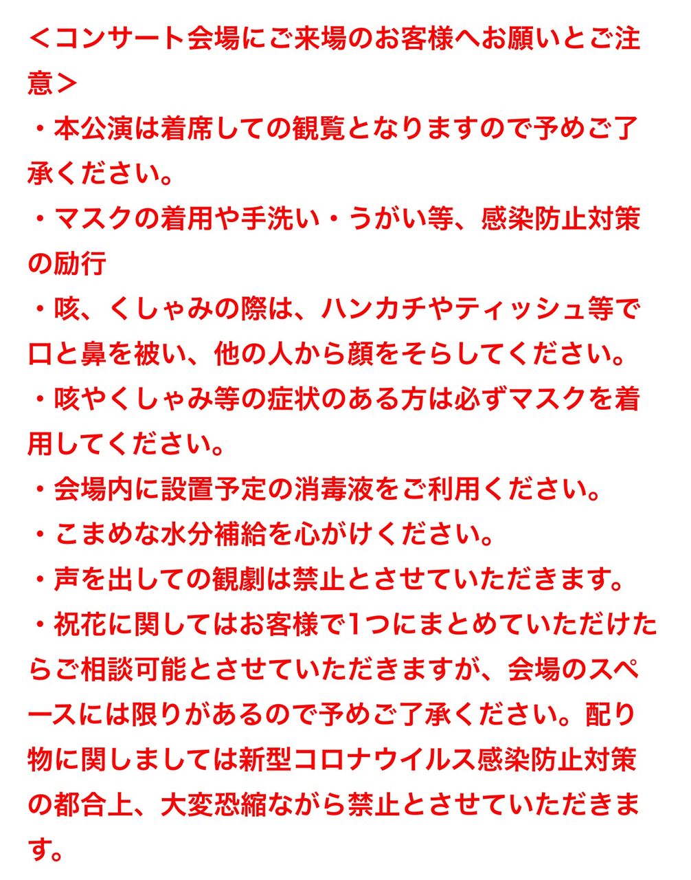 公演中に飛び跳ねる行為は禁止、指定された座席以外に座ったら退場とは、赤字で強調されて書かれてる